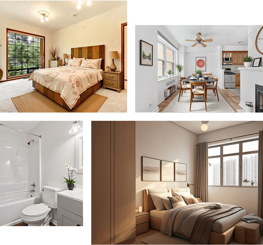 Stage living rooms, bedrooms, or kitchens in 10 seconds—no physical furniture needed. Save 90% vs. manual staging costs. Start with 60 images for $16.